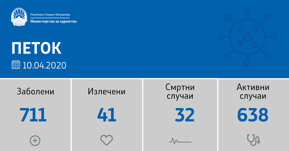Со ова вкупната бројка на дијагностицирани пациенти со Ковид-19 во нашата земја изнесува 711 лица.